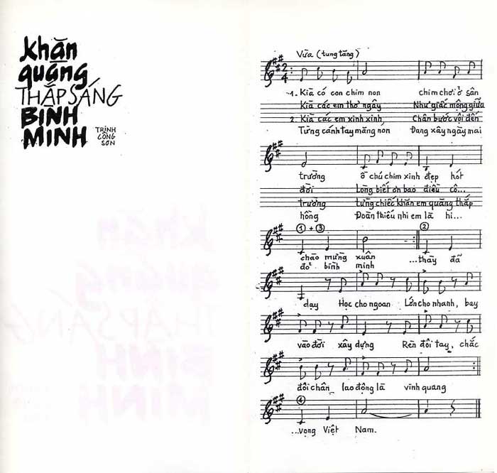 1. Đó là ca khúc sau (thấy rõ anh Ninh Quang Trường hướng dẫn các em múa hát trên kênh Bibi - một kênh truyền hình mà thiếu nhi Việt Nam rất thích). Tên ca khúc là "Khăn quàng thắp sáng bình minh", đã đưa lên mạng từ tháng 12 năm 2012.