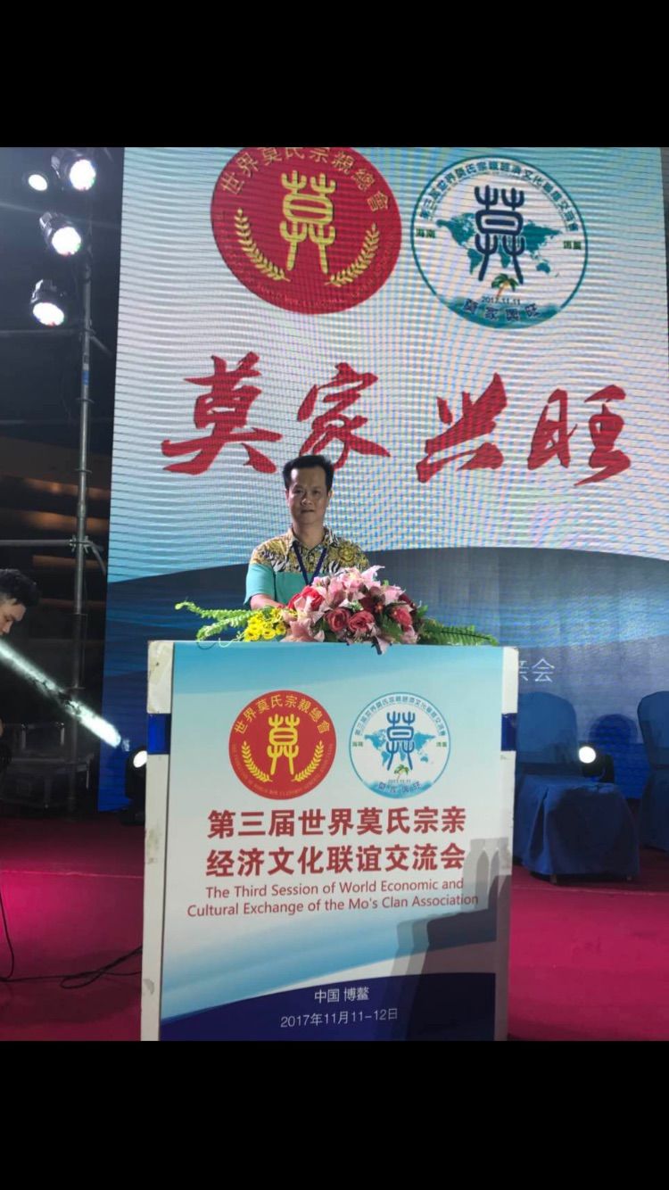 最先,我代表越南莫氏宗亲总会赴会团诚恳感谢世莫总会主席莫添来先生,政府机构,大会筹办单位,海南莫氏宗亲会邀请我们来到这个著名美丽梦景的海南博鳌胜地,你们提供的方便和协助使我们能够参加这个世界莫氏的第三次盛会。我也要感谢南宁莫氏宗亲会会长莫小民先生给我们宝贵的帮助,使我们顺利到达这里。