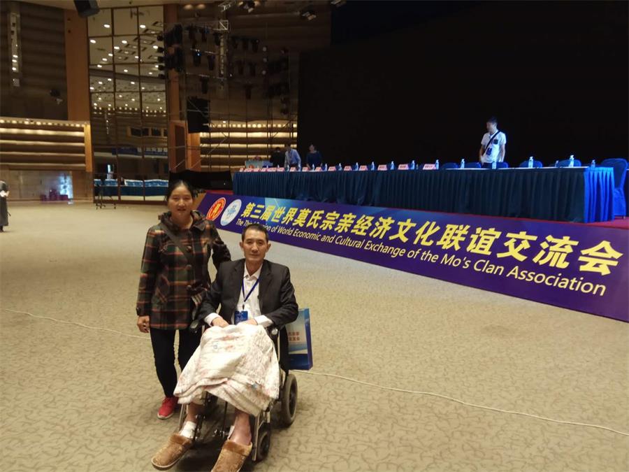 第三届世莫大会感人事迹之一:云南宗亲莫吉银,坐上轮椅,两脚打钢针,用五人护送,千里迢迢从云南赴海南参会,并参与所有活动,钦佩。