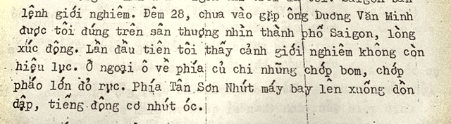 Anh ta yêu cầu tôi cho nói chuyện với tổng thống, tôi mời ông Minh đến nói chuyện. Câu chuyện chưa xong thì ở cổng trước, xe tăng đã vào dinh Độc Lập. Ông Minh nói: "Quân giải phóng đã vào tới dinh rồi. Thôi. Cúp".