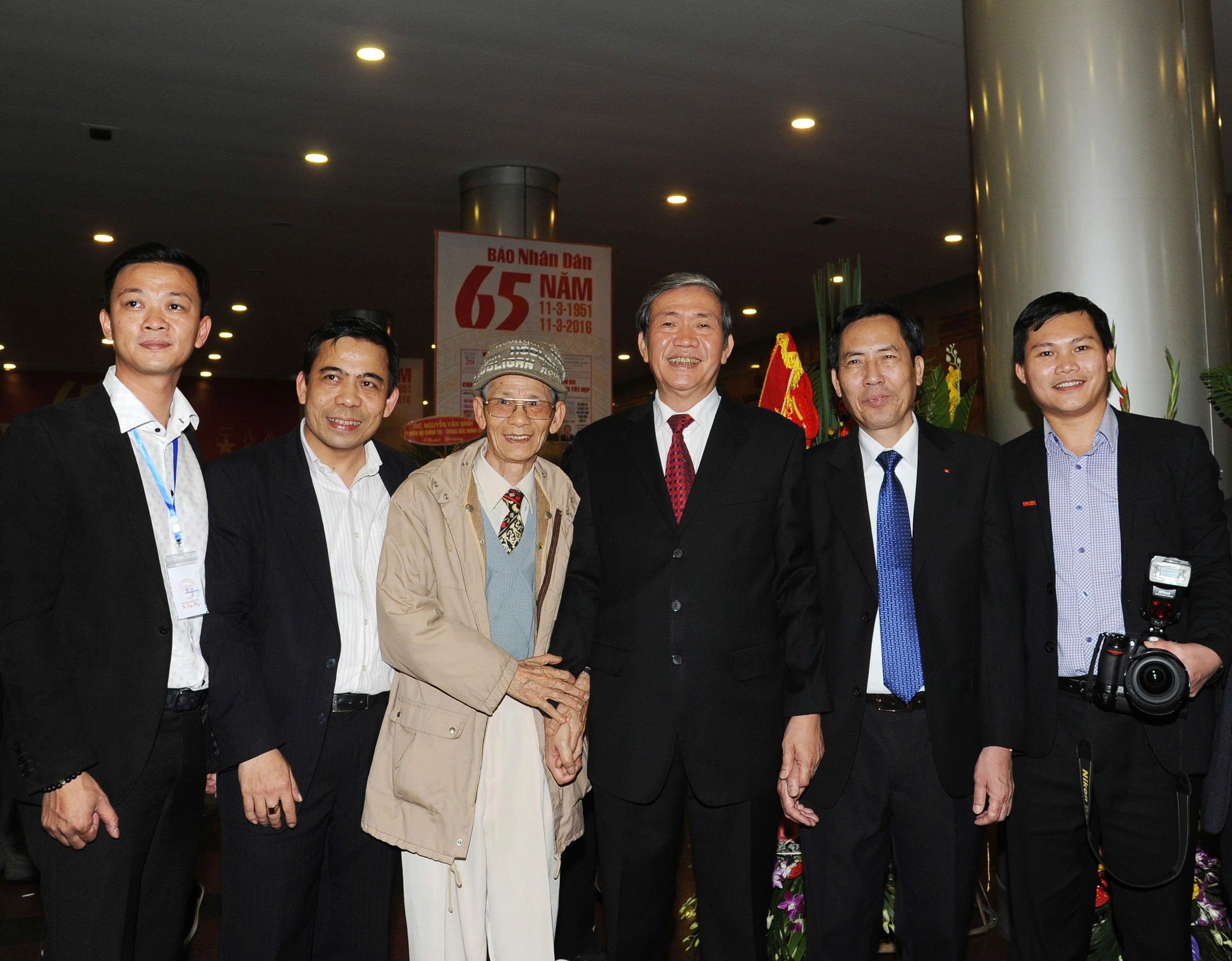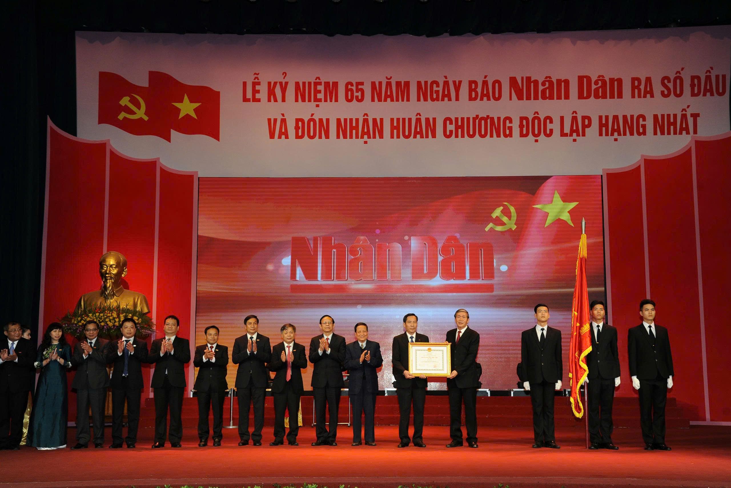 Đồng chí Đinh Thế Huynh cùng lãnh đạo, phóng viên, biên tập viên tại lễ kỷ niệm 65 năm Ngày Báo Nhân Dân ra số đầu và đón nhận Huân chương Độc lập hạng nhất. (Ảnh: TRẦN HẢI)