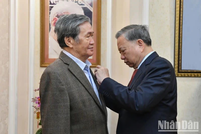 Tổng Bí thư Tô Lâm trao Huân chương Hồ Chí Minh tặng đồng chí Đinh Thế Huynh. Ảnh: Báo Nhân Dân