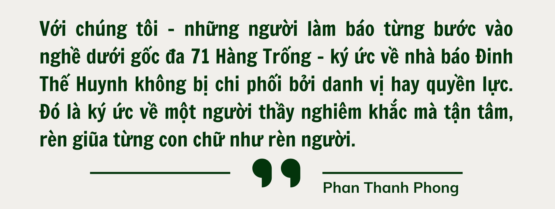 Với chúng tôi - những người làm báo từng bước vào nghề dưới gốc đa 71 Hàng Trống - ký ức về nhà báo Đinh Thế Huynh không bị chi phối bởi danh vị hay quyền lực. Đó là ký ức về một người thầy nghiêm khắc mà tận tâm, rèn giũa từng con chữ như rèn người.