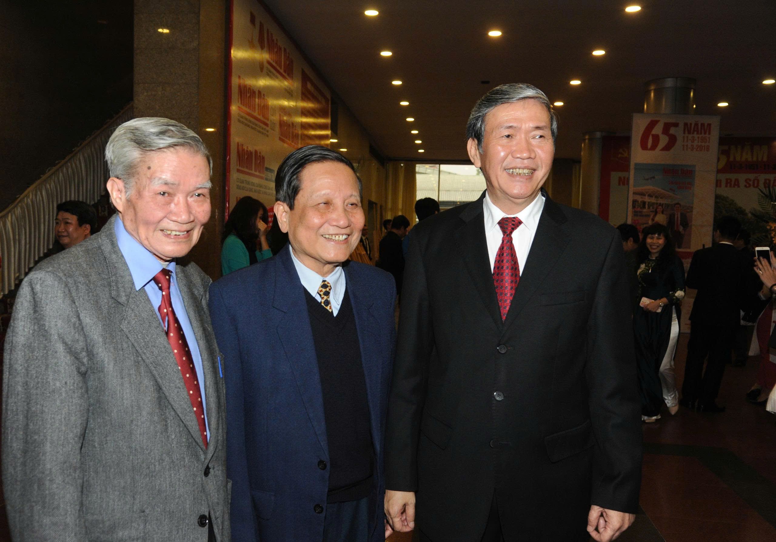 Đồng chí Đinh Thế Huynh, Ủy viên Bộ Chính trị, Thường trực Ban Bí thư với các nhà báo lão thành Báo Nhân Dân tại lễ kỷ niệm 65 năm Ngày Báo Nhân Dân ra số đầu (11/3/1951 - 11/3/2016) và đón nhận Huân chương Độc lập hạng nhất. (Ảnh: TRẦN HẢI)